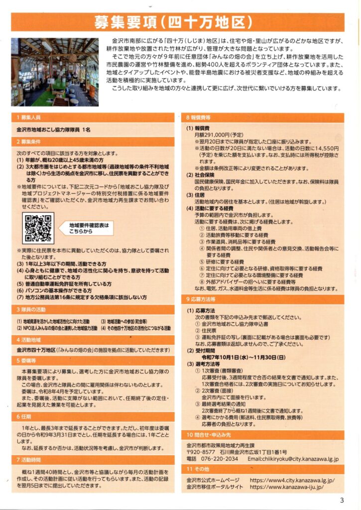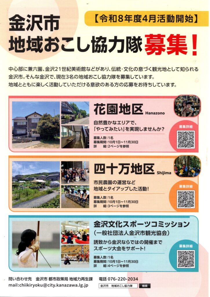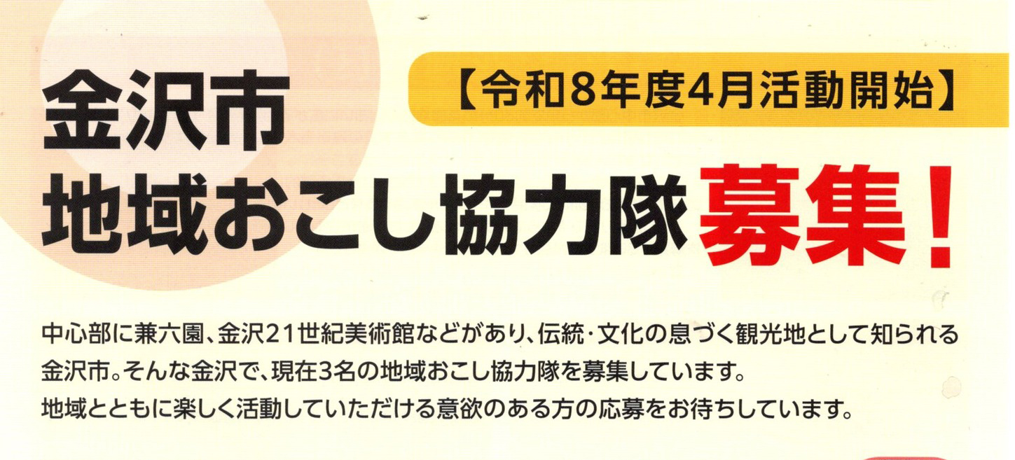 地域おこし協力隊の隊員募集が10月1日より金沢市ホームページで首都圏他公開募集が始まります。