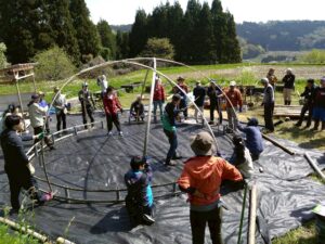 材料は、竹ドームであれば1棟あたり約30本の竹やビニール、ボルトが必要。5~6人で作業すれば、2週間程度で作れます。材料費は4万円弱で、鉄パイプの農業用ハウスに比べると、かなり、コストが抑えられるメリットがあります。